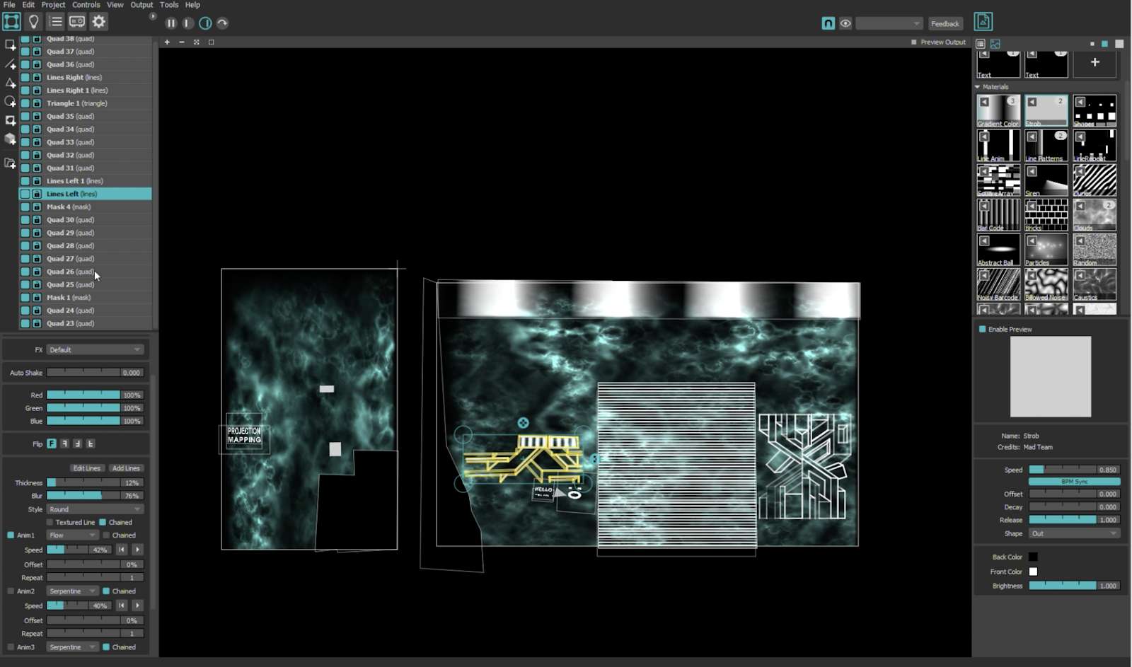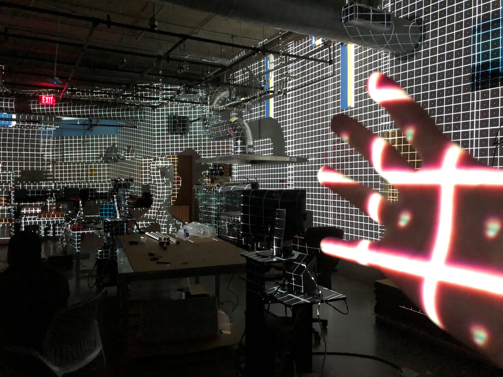 We had to use multiple projectors to cover whole studio. When we set these projectors up, it became a problem – the Edges. The edges were sharp, so we needed to smooth them. We used a tool called “blend edges”, to overlap the projection’s canvas and used madmapper to blend/soften the edges.